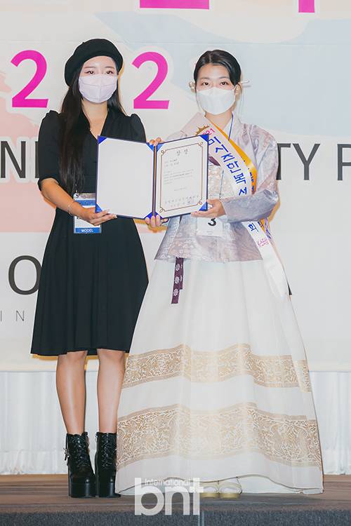 [bnt포토] '2021 미스(미시즈) 한복선발대회'에서 기념촬영하는 미시즈 k스타상 김지선-모델 송진영