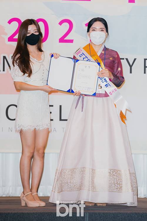 [bnt포토] '2021 미스(미시즈) 한복선발대회'에서 기념촬영하는 미시즈 맵시상 박혜경-모델 강지은
