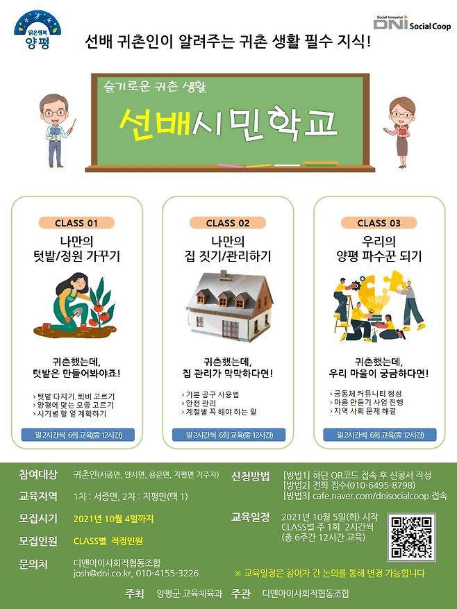 [헤럴드경제(양평)=박준환 기자]양평군(군수 정동균)은 선배 귀촌인이 알려주는 귀촌 생활 필수 지식 전수를 위한 슬기로운 귀촌 생활 ‘선배시민학교’ 운영 참여자를 모집한다고 29일 밝혔다.