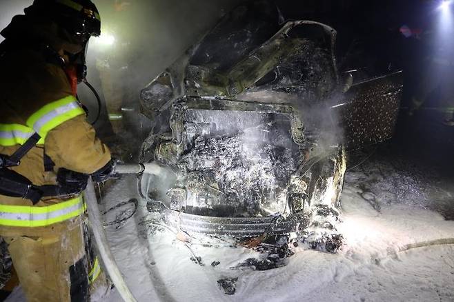 경찰은 전소 및 훼손된 차량 주변에서 인화물질인 엔진오일통과 휴지, 소화기 등이 발견된 점 등을 토대로 누군가 차량에 일부러 불을 낸 것으로 보고 조사 중이다. 사진은 전소된 차량. 2021.9.29