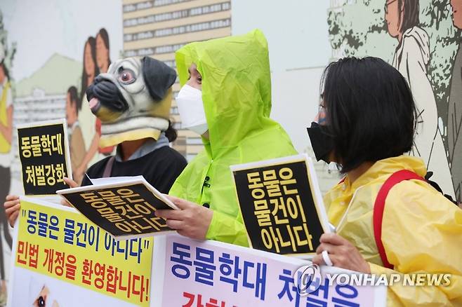 (서울=연합뉴스) 강민지 기자 = 한국동물보호연합 활동가 등이 29일 오후 서울 광화문 이순신동상 앞에서 '동물은 물건이 아니다' 민법 개정안을 환영하며, 동물학대 처벌 강화를 촉구하는 기자회견을 하고 있다. 2021.9.29
