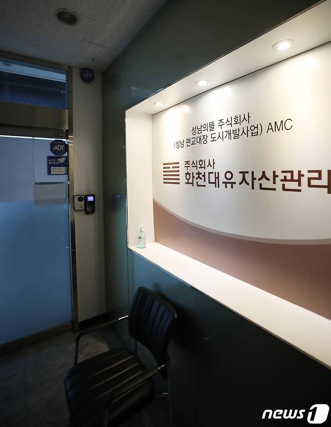 (성남=뉴스1) 김영운 기자 = 검찰이 29일 경기도 성남시 대장동 개발사업의 특혜 의혹을 받는 자산관리회사 화천대유 사무실을 압수수색하며 본격 수사에 착수했다. 사진은 압수수색이 진행중인 화천대유 사무실 입구. 2021.9.29/뉴스1
