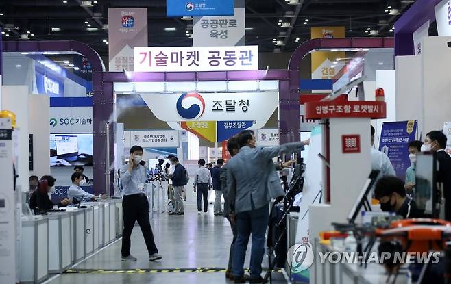 (고양=연합뉴스) 김병만 기자 = 29일 경기도 고양시 킨텍스에서 열린 '코리아 나라장터 엑스포 2021'에서 참가자 및 관계 기업인들이 전시장을 둘러보고 있다.