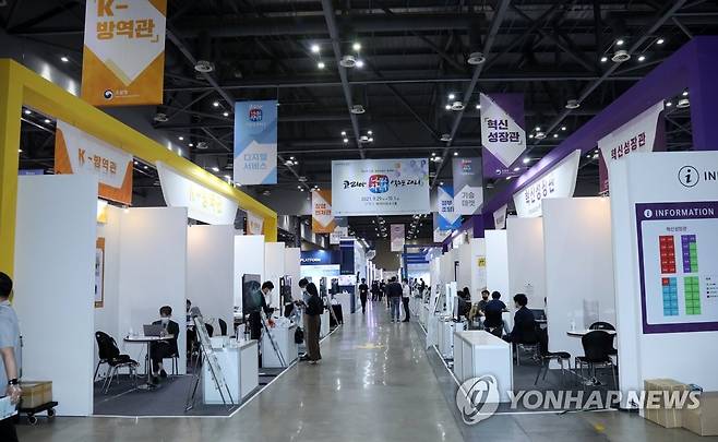 (고양=연합뉴스) 김병만 기자 = 29일 경기도 고양시 킨텍스에서 열린 '코리아 나라장터 엑스포 2021'에서 참가자 및 기업인들이 전시장을 둘러보고 있다.