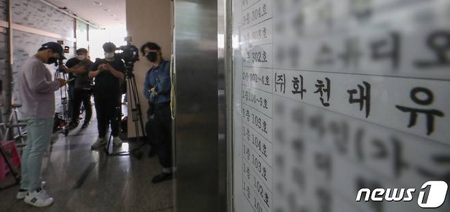 (성남=뉴스1) 김영운 기자 = 29일 오전 검찰의 압수수색이 진행 중인 경기도 성남시 화천대유자산관리 사무실 건물 1층에 취재진이 대기하고 있다. 2021.9.29/뉴스1