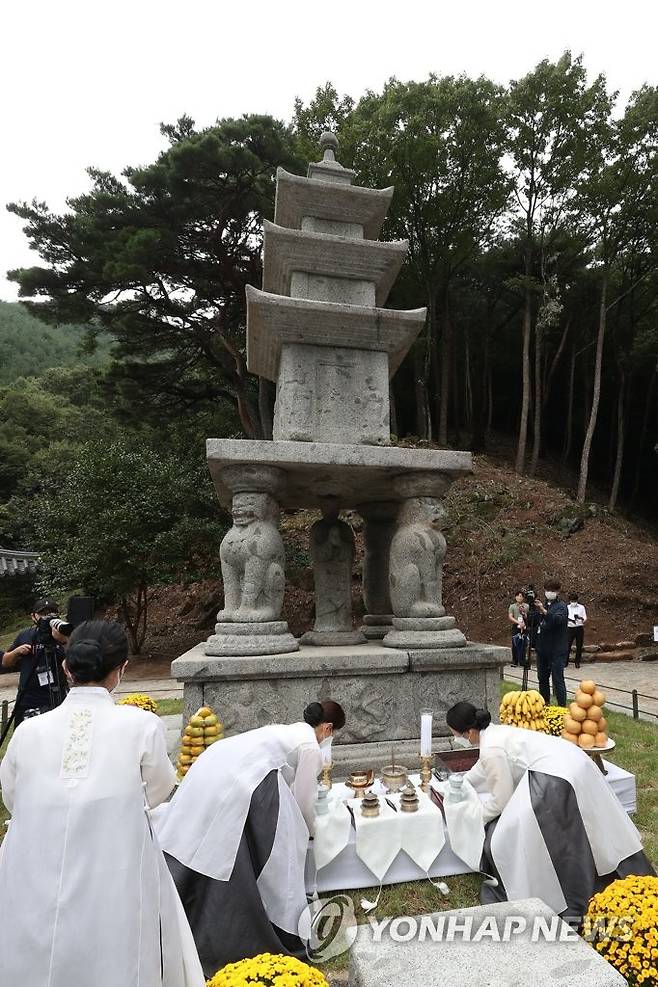 (구례=연합뉴스) 정회성 기자 = 29일 오후 전남 구례군 마산면 화엄사에서 사사자(四獅子) 삼층석탑의 해체·수리 공사를 알리는 회향식이 열리고 있다. 국보인 화엄사 사사자 삼층석탑은 2011년 정밀 진단에서 보수 필요성이 제기돼 보수 공사를 거쳐 제 모습을 찾았다. 2021.9.29