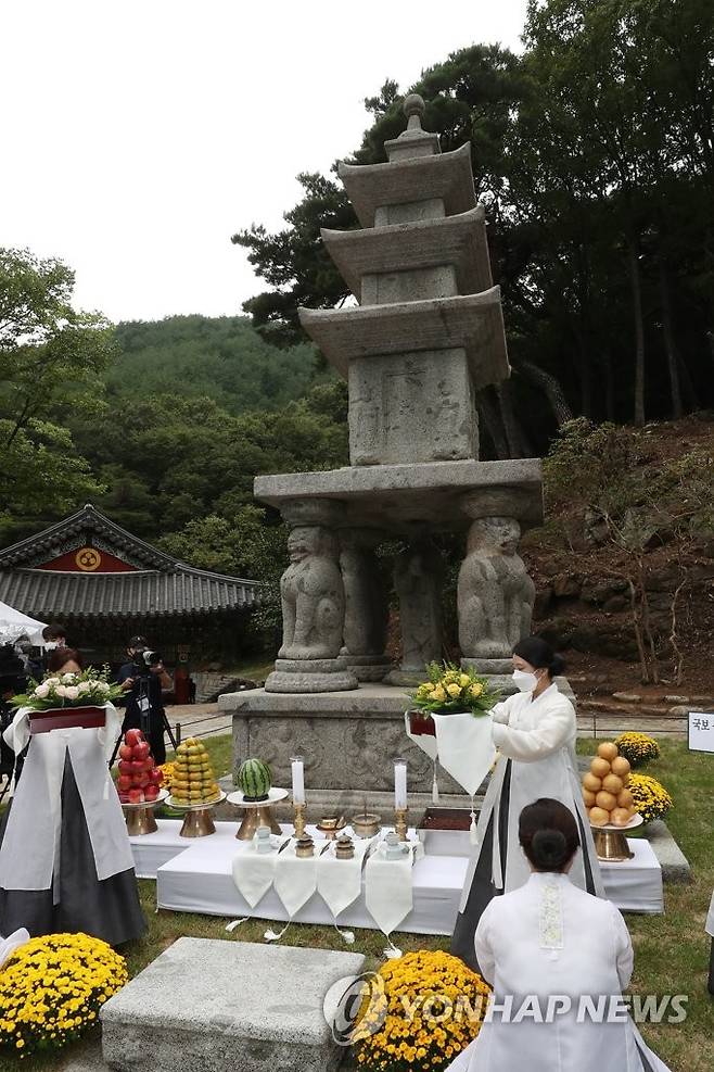 (구례=연합뉴스) 정회성 기자 = 29일 오후 전남 구례군 마산면 화엄사에서 사사자(四獅子) 삼층석탑의 해체·수리 공사를 알리는 회향식이 열리고 있다. 국보인 화엄사 사사자 삼층석탑은 2011년 정밀 진단에서 보수 필요성이 제기돼 보수 공사를 거쳐 제 모습을 찾았다. 2021.9.29