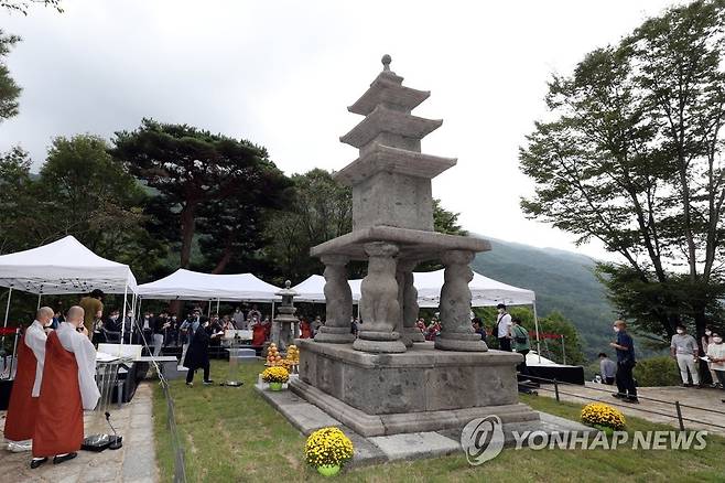 (구례=연합뉴스) 정회성 기자 = 29일 오후 전남 구례군 마산면 화엄사에서 사사자(四獅子) 삼층석탑의 해체·수리 공사를 알리는 회향식이 열리고 있다. 국보인 화엄사 사사자 삼층석탑은 2011년 정밀 진단에서 보수 필요성이 제기돼 보수 공사를 거쳐 제 모습을 찾았다. 2021.9.29