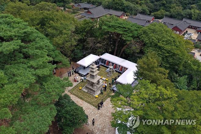 (구례=연합뉴스) 정회성 기자 = 29일 오후 전남 구례군 마산면 화엄사에서 사사자(四獅子) 삼층석탑의 해체·수리 공사를 알리는 회향식이 열리고 있다. 국보인 화엄사 사사자 삼층석탑은 2011년 정밀 진단에서 보수 필요성이 제기돼 보수 공사를 거쳐 제 모습을 찾았다. 2021.9.29