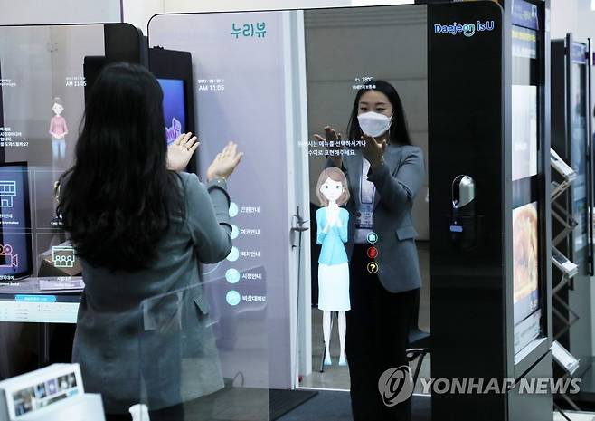 (고양=연합뉴스) 김병만 기자 = 29일 경기도 고양시 킨텍스에서 열린 '코리아 나라장터 엑스포 2021'에서 한 업체 관계자가 AI기반 스마트 정보ㆍ민원 안내 시스템 '누리뷰'를 시연하고 있다.