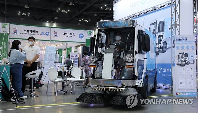 (고양=연합뉴스) 김병만 기자 = 29일 경기도 고양시 킨텍스에서 열린 '코리아 나라장터 엑스포 2021'에서 한 참가 업체가 전기도로청소차를 소개하고 있다.
