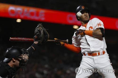 epa09494679 San Francisco Giants pinch hitter Thairo Estrada (R) gets hit by a pitch by Arizona Diamondbacks relief pitcher Brett de Geus as Arizona Diamondbacks catcher Carson Kelly (L) looks on during the seventh inning of their MLB game at Oracle Park in San Francisco, California, USA, 28 September 2021. EPA/JOHN G. MABANGLO