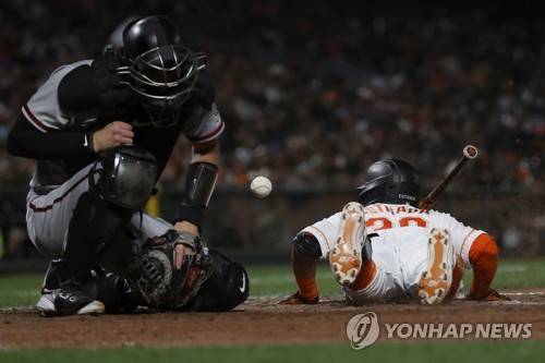 epa09494678 San Francisco Giants pinch hitter Thairo Estrada (R) gets hit by a pitch by Arizona Diamondbacks relief pitcher Brett de Geus as Arizona Diamondbacks catcher Carson Kelly (L) looks on during the seventh inning of their MLB game at Oracle Park in San Francisco, California, USA, 28 September 2021. EPA/JOHN G. MABANGLO