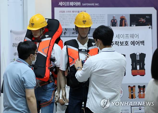 (고양=연합뉴스) 김병만 기자 = 29일 경기도 고양시 킨텍스에서 열린 '코리아 나라장터 엑스포 2021'에서 한 업체 관계자가 세이프웨어 제품을 소개하고 있다.