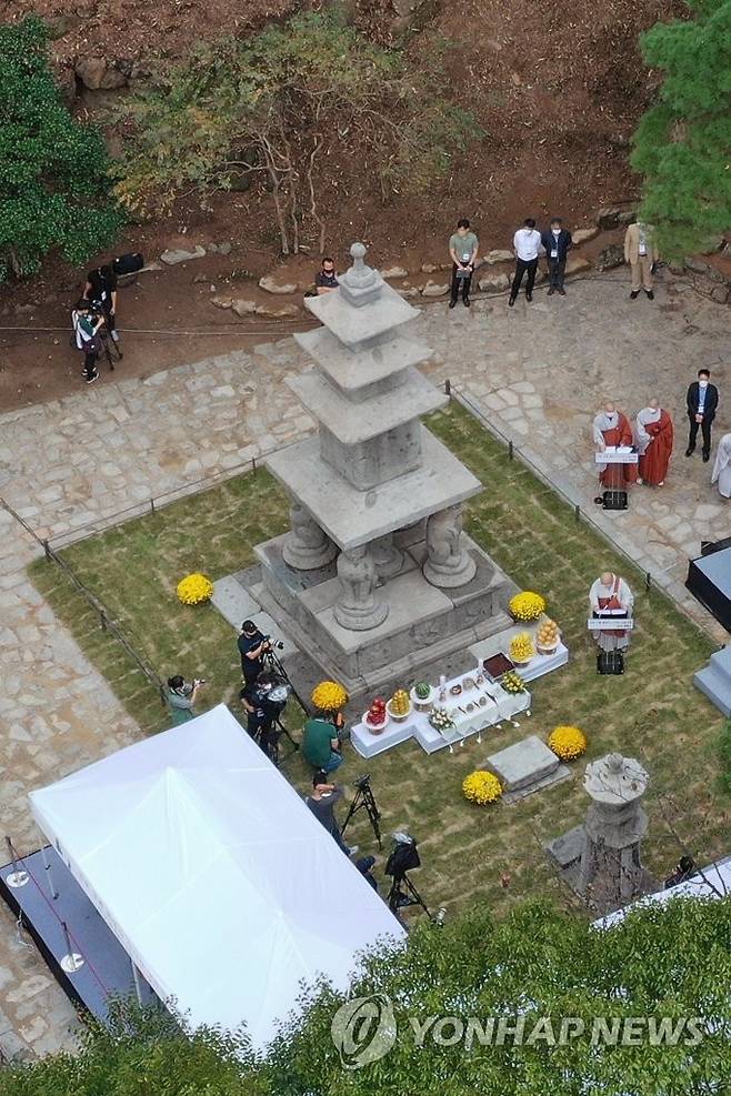 (구례=연합뉴스) 정회성 기자 = 29일 오후 전남 구례군 마산면 화엄사에서 사사자(四獅子) 삼층석탑의 해체·수리 공사를 알리는 회향식이 열리고 있다. 국보인 화엄사 사사자 삼층석탑은 2011년 정밀 진단에서 보수 필요성이 제기돼 보수 공사를 거쳐 제 모습을 찾았다. 2021.9.29