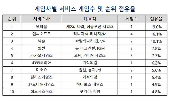 신작 '제2의 나라: 크로스 월드'와 '마블 퓨처 레볼루션'을 더한 넷마블의 순위 점유율이 19%로 가장 높게 나타났다. 리니지 모바일 시리즈와 '블레이드&소울2' '트릭스터M'을 앞세운 엔씨소프트가 16.1%로 뒤를 이었으며 넥슨은 기존 게임 중심으로 10.1% 점유율을 기록, 3위에 올랐다.