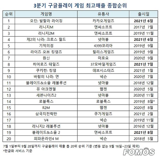 지난 7월 1일부터 9월 28일까지 국내에서 가장 많이 활용하는 플랫폼인 구글플레이의 최고 매출 순위 1위부터 20위까지 오른 게임 44종 중에서도 자주 이름을 올린 20종 게임들로 '3분기 구글플레이 게임 최고매출 종합순위'를 제작했다.