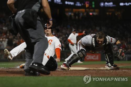 epa09494684 Arizona Diamondbacks catcher Daulton Varsho (R) forces out San Francisco Giants Wilmer Flores (C) at home plate during the sixth inning of their MLB game at Oracle Park in San Francisco, California, USA, 28 September 2021. EPA/JOHN G. MABANGLO