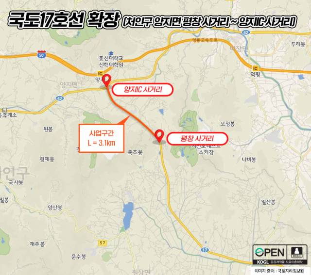 국도 17호선 처인구 양지면 평창사거리~양지IC 3.1㎞ 구간이 기존 4차로에서 6차로로 확장된다.