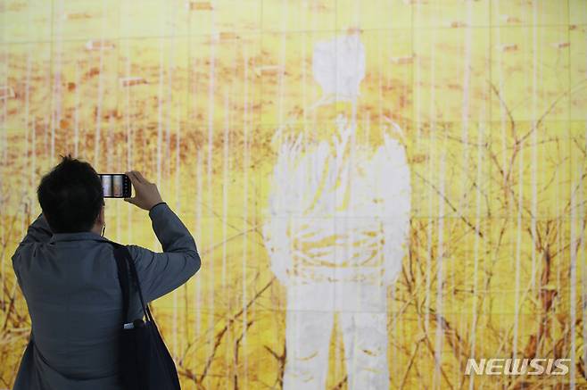 [파주=뉴시스] 박미소 기자 = 29일 오전 경기 파주시 남북출입사무소에 마련된 DMZ 평화통일문화공간 Uni 마루에서 출입기자단 소속 취재진이 홍순명 작가의 'LOST' 작품을 감상하고 있다. 2021.09.29. misocamera@newsis.com