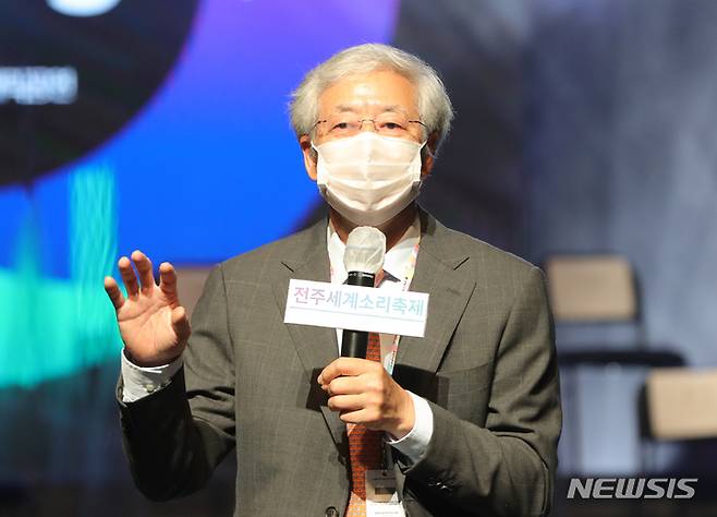 [전주=뉴시스] 김얼 기자 = 김한 전주세계소리축제 조직위원장이 29일 전북 전주시 한국소리문화전당에서 열린 2021 전주세계소리축제 개막 기자회견에 참석해 환영사를 하고 있다. 2021.09.29. pmkeul@newsis.com