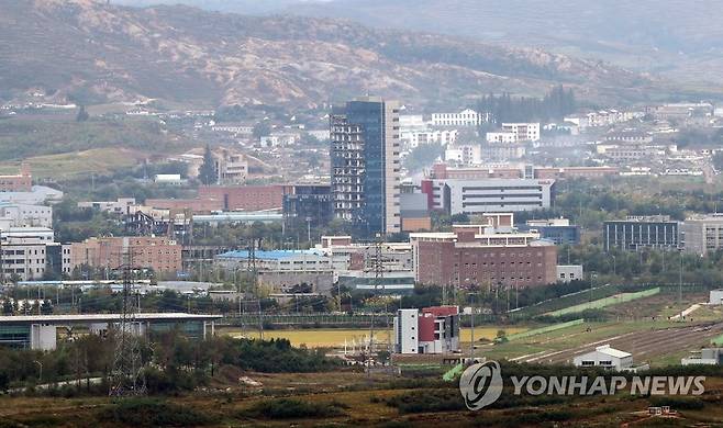 (파주=연합뉴스) 백승렬 기자 = 29일 경기도 파주시 도라전망대에서 바라본 개성공단 일대에서 지난해 북한이 폭파한 남북공동연락사무소와 폭파 시 충격으로 훼손된 개성공단지원센터가 1년 넘게 방치되어 있다. 2021.9.29