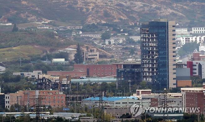 (파주=연합뉴스) 백승렬 기자 = 29일 경기도 파주시 도라전망대에서 바라본 개성공단 일대에서 지난해 북한이 폭파한 남북공동연락사무소와 폭파 시 충격으로 훼손된 개성공단지원센터가 1년 넘게 방치되어 있다. 2021.9.29