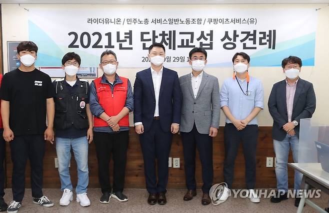 (서울=연합뉴스) 이정훈 기자 = 박정훈 라이더유니온 위원장(왼쪽 두번째)과 이선규 민주노총 서비스일반노조 위원장(왼쪽 세번째)이 29일 오후 서울 종로구 한 모임센터에서 장기환 쿠팡이츠서비스 대표(왼쪽 네섯번째) 등 쿠팡이츠서비스 사측과 단체교섭 상견례를 하기에 앞서 기념촬영을 하고 있다. 2021.9.29