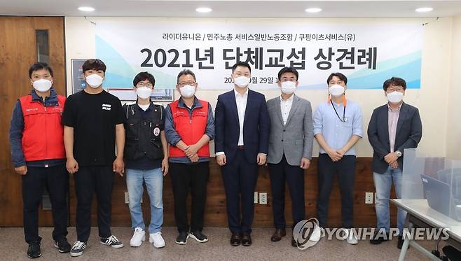 (서울=연합뉴스) 이정훈 기자 = 박정훈 라이더유니온 위원장(왼쪽 세번째)과 이선규 민주노총 서비스일반노조 위원장(왼쪽 네번째)이 29일 오후 서울 종로구 한 모임센터에서 장기환 쿠팡이츠서비스 대표(왼쪽 다섯번째) 등 쿠팡이츠서비스 사측과 단체교섭 상견례를 하기에 앞서 기념촬영을 하고 있다. 2021.9.29