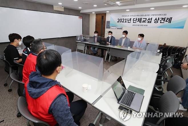 (서울=연합뉴스) 이정훈 기자 = 라이더유니온과 민주노총 서비스일반노조 등 공동교섭단이 29일 오후 서울 종로구 한 모임센터에서 쿠팡이츠서비스 사측과 단체교섭 상견례를 하고 있다. 2021.9.29