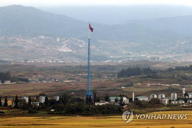 (파주=연합뉴스) 백승렬 기자 = 29일 경기도 파주시 도라전망대에서 바라본 서부전선 비무장지대(DMZ)에서 북한 기정동 인공기가 펄럭이고 있다. 2021.9.29