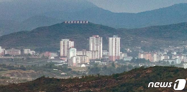 29일 경기도 파주시 도라산전망대에서 바라본 개성 시내의 아파트 너머로 '우리국가제일주의' 문구가 보인다. 2021.9.29/뉴스1