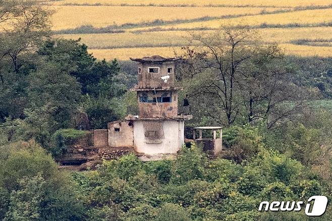 29일 경기도 파주시 도라산전망대에서 바라본 북한군 초소에 북한군이 밖을 보고 있다. 2021.9.29/뉴스1