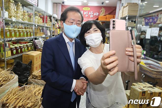 (영주=뉴스1) 공정식 기자 = 홍준표 국민의힘 대선 경선 예비후보가 29일 오후 경북 영주시 풍기인삼시장을 찾아 상인들과 기념사진을 찍고 있다. 2021.9.29/뉴스1