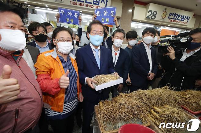 (영주=뉴스1) 공정식 기자 = 홍준표 국민의힘 대선 경선 예비후보가 29일 오후 경북 영주시 풍기인삼시장을 찾아 인삼을 구입하고 있다. 2021.9.29/뉴스1