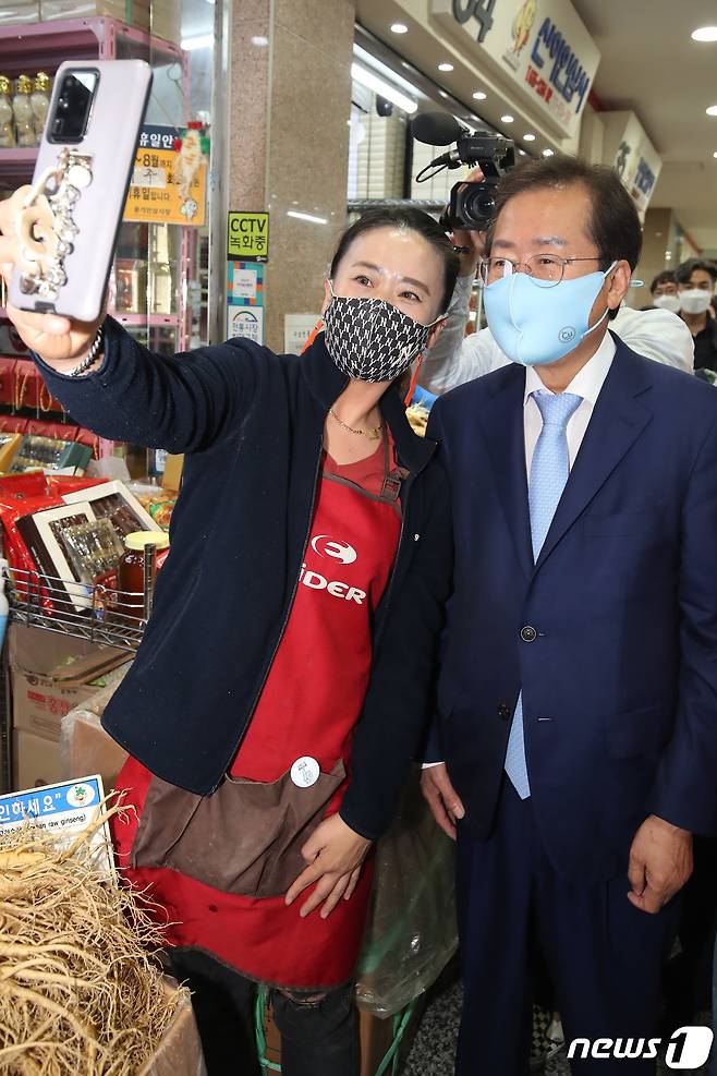 (영주=뉴스1) 공정식 기자 = 홍준표 국민의힘 대선 경선 예비후보가 29일 오후 경북 영주시 풍기인삼시장을 찾아 상인들과 기념사진을 찍고 있다. 2021.9.29/뉴스1