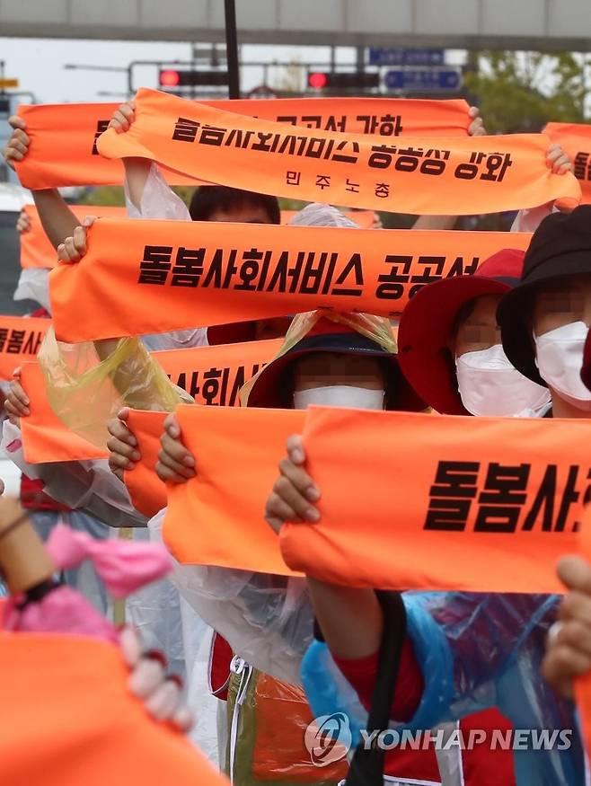 (세종=연합뉴스) 김준범 기자 = 민주노총 서비스연맹 전국요양서비스노동조합 등이 29일 오후 세종시 어진동 고용노동부 앞에서 돌봄노동자 처우개선 등을 요구하며 결의대회를 하고 있다. 2021.9.29