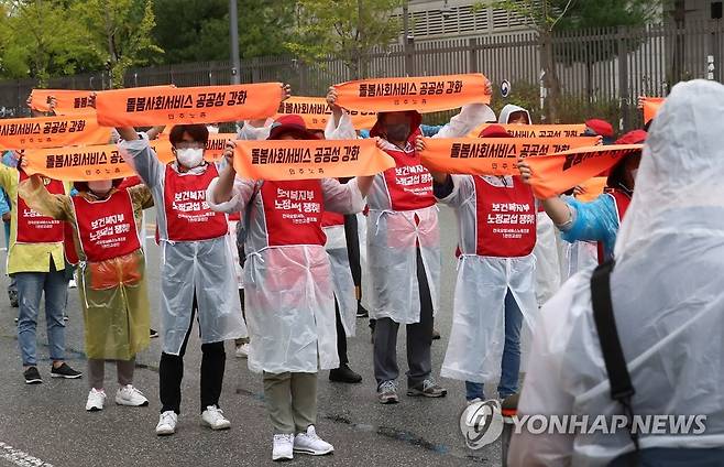 (세종=연합뉴스) 김준범 기자 = 민주노총 서비스연맹 전국요양서비스노동조합 등이 29일 오후 세종시 어진동 고용노동부 앞에서 돌봄노동자 처우개선 등을 요구하며 결의대회를 하고 있다. 2021.9.29