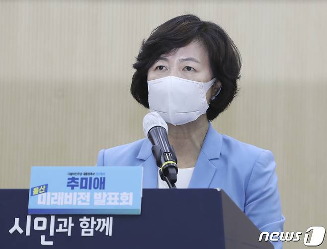 (울산=뉴스1) 윤일지 기자 = 추미애 더불어민주당 대선 경선 후보가 29일 오후 울산시의회 대회의실에서 열린 울산 미래비전 발표회에서 정책 공약을 발표하고 있다. 2021.9.29/뉴스1