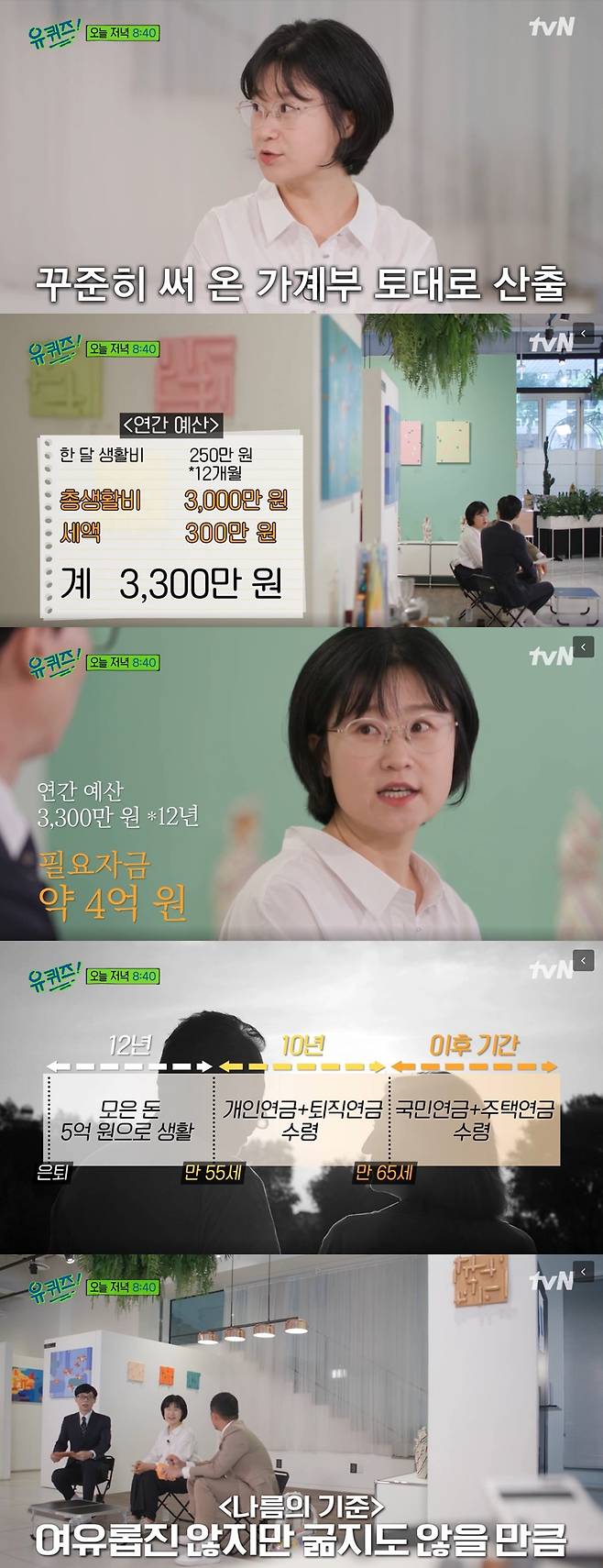 또 “연금도 따로 준비했다. 만 55세부터 10년간 연금을 수령하고, 만 65세 이후에는 국민연금을 수령할 것이다. 이후에 몸도 좀 아프고, 돈도 좀 더 필요할 것이라 주택연금도 준비해뒀다”라며 철저한 계획을 설명했다.