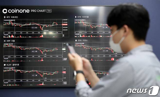 (서울=뉴스1) 박지혜 기자 = 당초 큰 영향을 끼치지 않을 것으로 보였던 중국발 리스크가 암호화폐 시장에 준 충격이 계속되고 있는 가운데 29일 서울 용산구 코인원 고객센터 모니터에 비트코인 등 암호화폐 시세가 표시되고 있다.