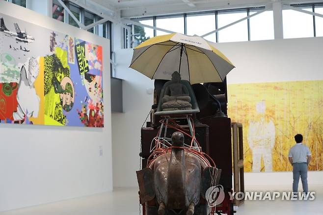 (파주=연합뉴스) 백승렬 기자 = 통일부는 옛 개성공단 출경동과 도라산역 등 DMZ에 문화예술공간을 개관하고 오는 11월 15일까지 비대면으로 '2021 DMZ Art&PeacePlatform전'을 열고 있다. 이번 전시는 경기도 파주시 남북출입사무소 내 'Uni마루'와 도라산역, 파주철거GP, 강원도 고성군 제진역, 국립통일교육원 등 모두 5개의 공간에서 열린다. 정연심 예술총감독이 기획한 이번 전시에는 백남준, 양혜규, 스튜디오 아더 스페이즈 등 국내외 유명작가 32명이 참여해 총 34점이 전시됐다. 사진은 'Uni마루'에 전시된 작품들. 2021.9.29