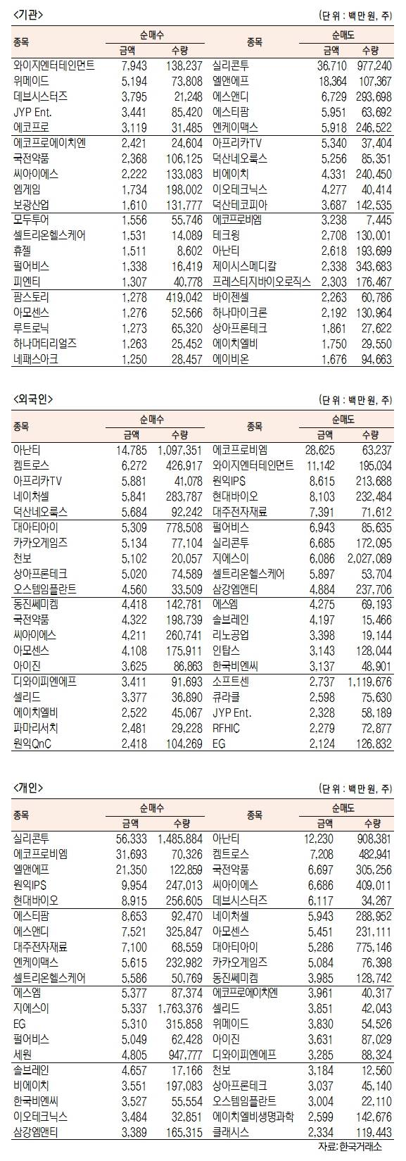 [표]코스닥 기관·외국인·개인 순매수·도 상위종목(9월 29일)