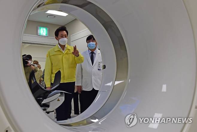 (서울=연합뉴스) 황광모 기자 = 오세훈 서울시장이 29일 서울 중랑구 서울의료원 내 응급의료센터 신축 현장을 찾아 방사선 치료기를 살펴보고 있다. 2021.9.29 [공동취재]