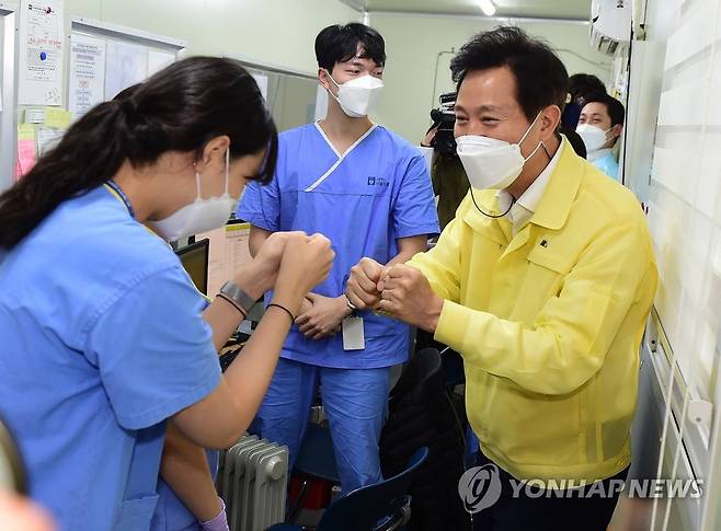 (서울=연합뉴스) 황광모 기자 = 오세훈 서울시장이 29일 서울 중랑구 서울의료원 내 응급의료센터 신축 현장 방문을 마친 뒤 의료진들을 격려하고 있다. 2021.9.29 [공동취재]