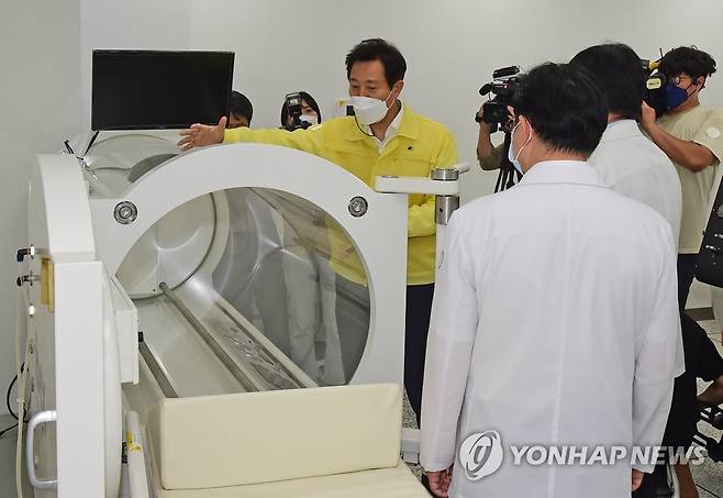 (서울=연합뉴스) 황광모 기자 = 오세훈 서울시장이 29일 서울 중랑구 서울의료원 내 응급의료센터 신축 현장을 찾아 고압산소챔버를 살펴보고 있다. 2021.9.29 [공동취재]