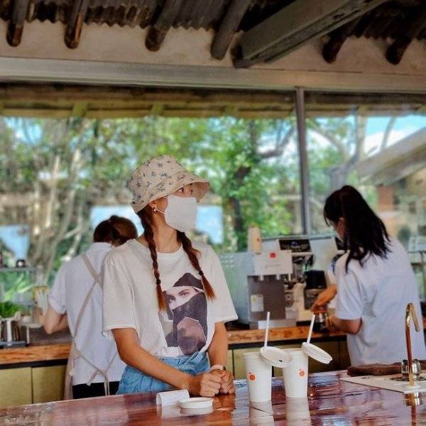 사진 속 박한별은 커피를 앞에 두고 손님을 기다리고 있다. 모자와 마스크로 얼굴을 가렸지만 박한별임을 알 수 있다. 양갈래 머리 스타일도 눈길을 끈다.
