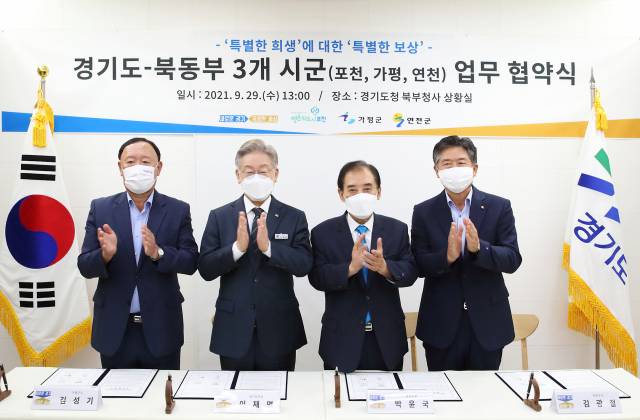 이재명 경기도지사와 박윤국 포천시장, 김성기 가평군수, 김광철 연천군수는 29일 경기도청 북부청사에서 이런 내용을 담은 ‘특별한 희생에 대한 특별한 보상을 위한 업무협약서’에 서명했다.