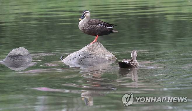 (전주=연합뉴스) 최영수 기자 = 29일 이슬비가 내리는 가운데 야생 오리들이 전북 전주시내 덕진천에 나와 한가로이 노닐고 있다. 2021.9.29