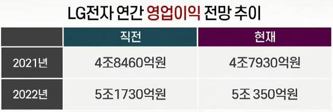 이유는 분기 및 연간 실적에 대한 기대가 낮아져서다. 증권사들은 LG전자의 올해 및 내년 연간 기준 영업이익을 직전 전망치 대비 각각 0.9%, 2.7% 하향 조정했다. 3분기 매출액은 역대급 매출을 기록했던 1분기(17조8000억원)를 넘어설 것으로 예상했지만, 영업이익은 전년 동기 대비 2.6% 감소한 1조원을 기록할 것으로 예상하고 있다.